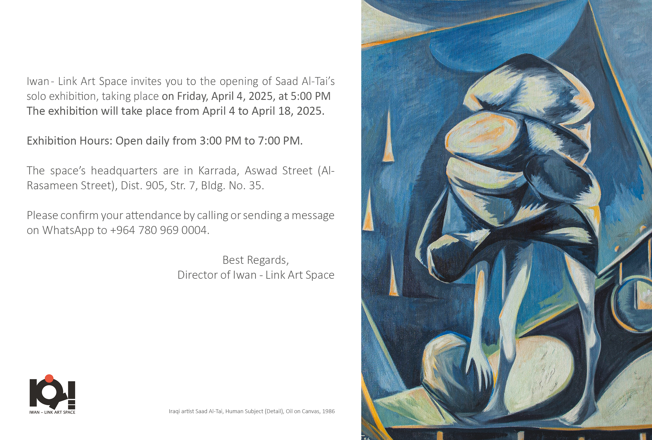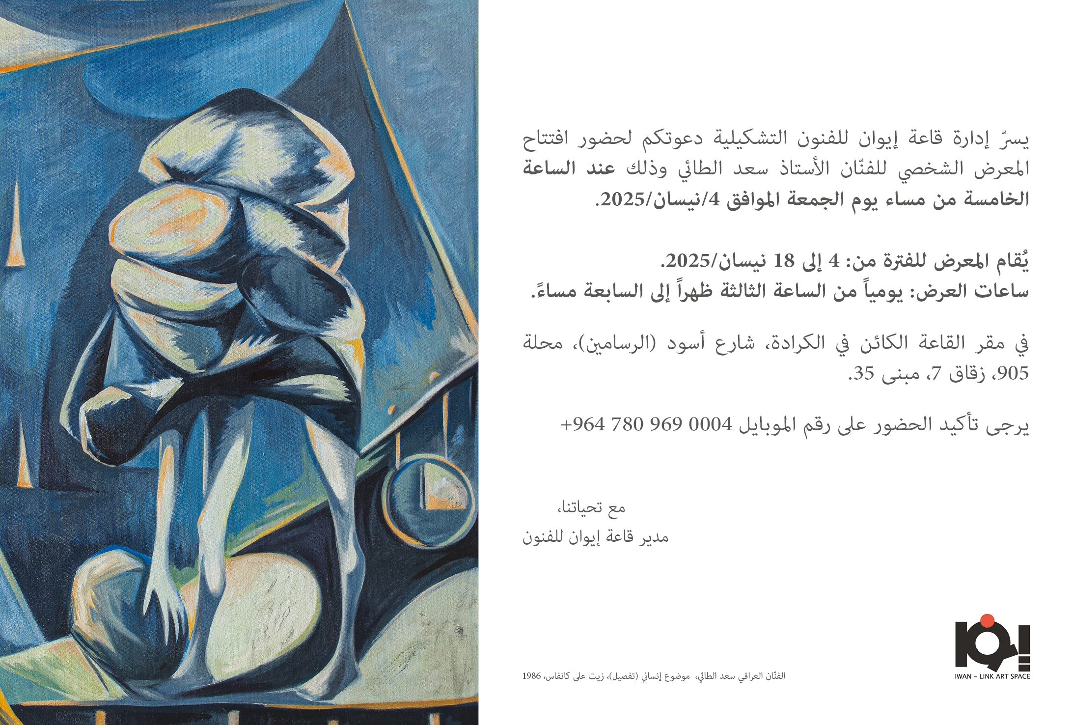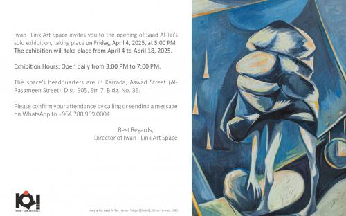 The solo exhibition of the artist Saad Al-Tai at the Iwan - Link Art Space in Baghdad, from April 4 to 18, 2025.