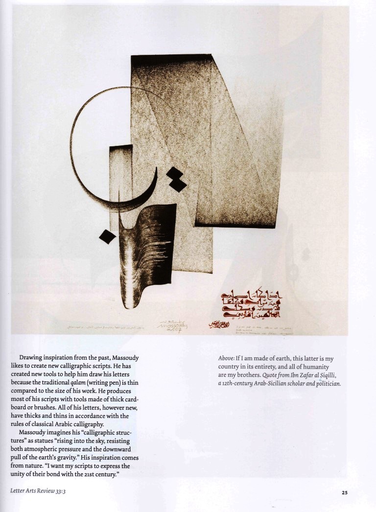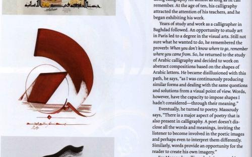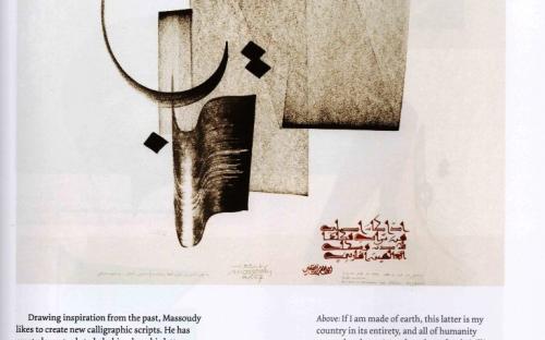 Hassan Massoudy was born in 1944 in Najaf He grew up in a traditional society He moved to Baghdad in 1961, where he was apprenticed to various calligraphers and exhibited a talent for classic Arabic calligraphy.